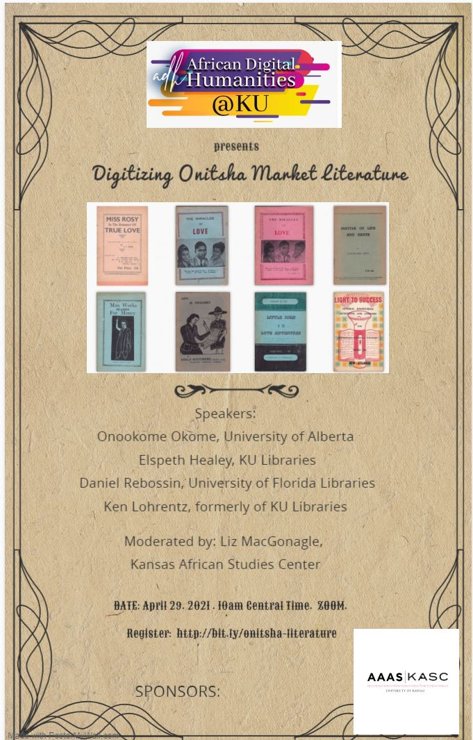 "Digitizing Onitsha Market Literature," a panel of librarians and scholars on market literature from Nigeria. https://africandh.ku.edu/digitizing-onitsha-market-literature
