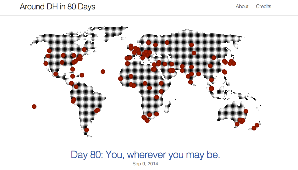 I'm happy to announce that our tour of the world of digital humanities in 80 days http://www.arounddh.org/ is over. Thanks to all who helped make the project possible and helped us spread the word. This was truly a project that involved collaboration from people all over the world. You can take a look for yourself in the credits page http://www.arounddh.org/credits/. We hope that the project gave us all a broader view of what is going on globally. I personally learned an enormous amount working on this project and hope to do a write-up of those lessons at some point in the future. In the meantime I live you with a picture of the Full Journey http://www.arounddh.org/journey/.