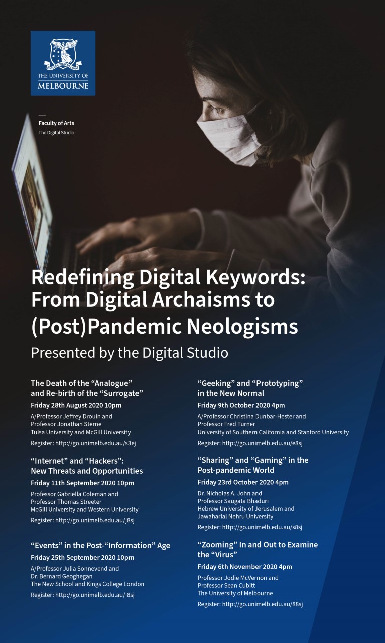Webinar Schedule August 28: The Death of the “Analogue” and Re-birth of the “Surrogate”https://arts.unimelb.edu.au/research/digital-studio/programs/seminar-series/2020/the-death-of-the-analogue-and-re-birth-of-the-surrogate A/Professor Jeffrey Drouin and Professor Jonathan Sterne Will Covid-19 lockdown finally abandon the analogue age? Will digital surrogate become mainstream in the near future? With the comprehensive digitization of communications across various spheres of human life from entertainment to education, from work to healthcare, the webinar will discuss what these words mean in pandemic time. More information.https://arts.unimelb.edu.au/research/digital-studio/programs/seminar-series/2020/the-death-of-the-analogue-and-re-birth-of-the-surrogate September 11: “Internet” and “Hackers”: New Threats and Opportunitieshttps://arts.unimelb.edu.au/research/digital-studio/programs/seminar-series/2020/internet-and-hackers-new-threats-and-opportunities Professor Gabriella Coleman and Professor Thomas Streeter Has Covid-19 transformed how we will live in the Internet in our digital future? What are the democratic promises of hacktivism and the security dangers of hacker cybercrimes? This webinar will explore the social, ethical and political implications of the new technology-society relationships in the (post)pandemic times of this free-wheeling horizon of and expanded cyberspace. More information.https://arts.unimelb.edu.au/research/digital-studio/programs/seminar-series/2020/internet-and-hackers-new-threats-and-opportunities September 25: “Events” in the Post-“Information” Agehttps://arts.unimelb.edu.au/research/digital-studio/programs/seminar-series/2020/events-in-the-post-information-age A/Professor Julia Sonnevend and Dr. Bernard Geoghegan Will the word information acquire new meanings under the pressure of technological transformations caused by the Covid-19 digital lockdown? How will people understand, define and experience major or minor events when they are limited to virtual encounters, online meetings and social media catch-ups? The webinar will interrogate old meanings and explore emerging connotations of what becomes information and whither the nature of an event in the seamless enfolding of the two in the online world. More information.https://arts.unimelb.edu.au/research/digital-studio/programs/seminar-series/2020/events-in-the-post-information-age October 9: “Geeking” and “Prototyping” the “New Normal”https://arts.unimelb.edu.au/research/digital-studio/programs/seminar-series/2020/geeking-and-prototyping-in-the-new-normal A/Professor Christina Dunbar-Hester and Professor Fred Turner Could we imagine and prototype human life in the post-pandemic world? Will geeks rule in the emerging social conditions of the new normal, or will they simply become extinct in the digital mainstreaming of daily life? The webinar will tackle the question of human typologies in new social formations and online networks. More information.https://arts.unimelb.edu.au/research/digital-studio/programs/seminar-series/2020/geeking-and-prototyping-in-the-new-normal October 23: “Sharing” and “Gaming” in the Post-pandemic Worldhttps://arts.unimelb.edu.au/research/digital-studio/programs/seminar-series/2020/sharing-and-gaming-in-the-post-pandemic-world Dr. Nicholas A. John and Professor Saugata Bhaduri How do we share online versus offline and what games can we play when limited within digital reality? What are the consequences on our health and well-being of non-stop digital sharing of our lives and emotions? And is it possible to transfer sport matches, games, and even such world sport mega-events as the Olympics into the digital world? The webinar will aim to answer these questions in conversation with Dr Nicholas A. John and Professor Saugata Bhaduri. More information.https://arts.unimelb.edu.au/research/digital-studio/programs/seminar-series/2020/sharing-and-gaming-in-the-post-pandemic-world